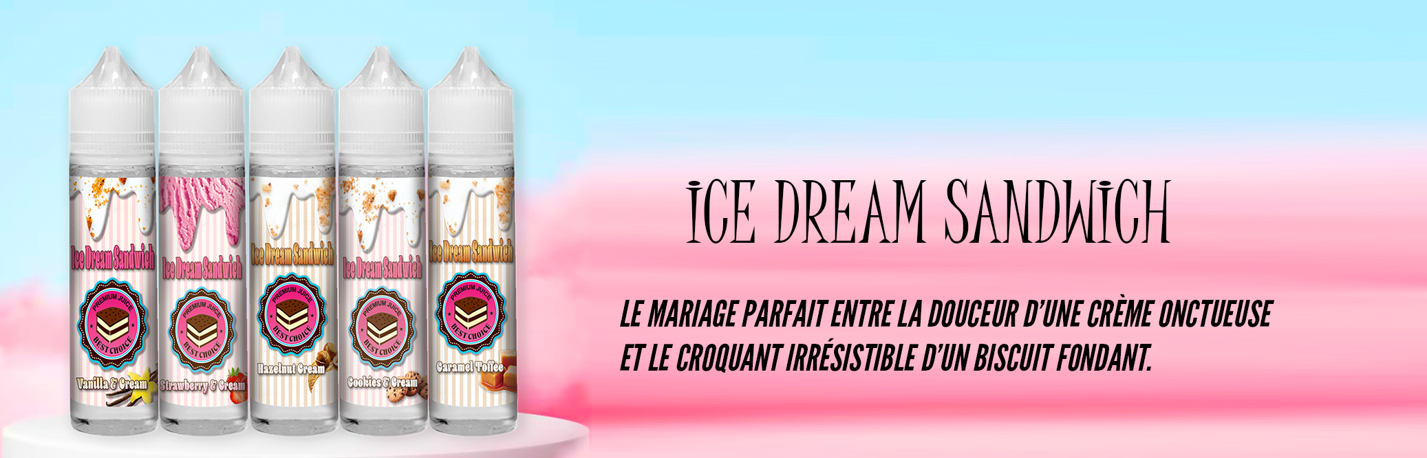 Amateurs de sensations gourmandes et de vape onctueuse, bienvenue dans l’univers de la gamme de e-liquides Ice dream sandwitch ! Cette collection est une invitation à explorer des saveurs riches et généreuses, où la crème est déclinée dans une variété de compositions raffinées, pour un plaisir inoubliable à chaque bouffée.